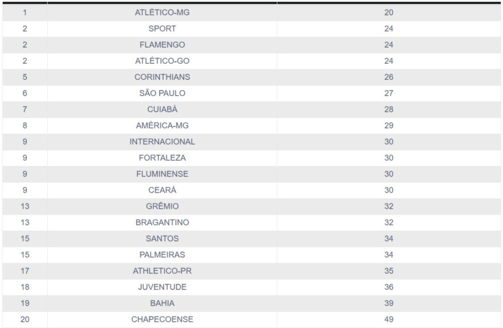 Disparado o Atlético-MG tomou vinte gols na competição, mas com 24 gols tomados estão: Sport, Flamengo e Atlético-GO, logo atrás com a segunda melhor defesa na Série A do Campeonato Brasileiro.