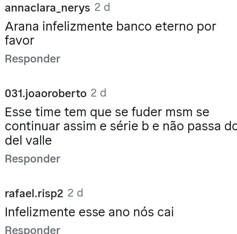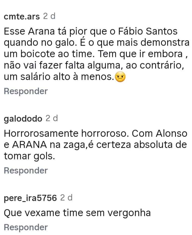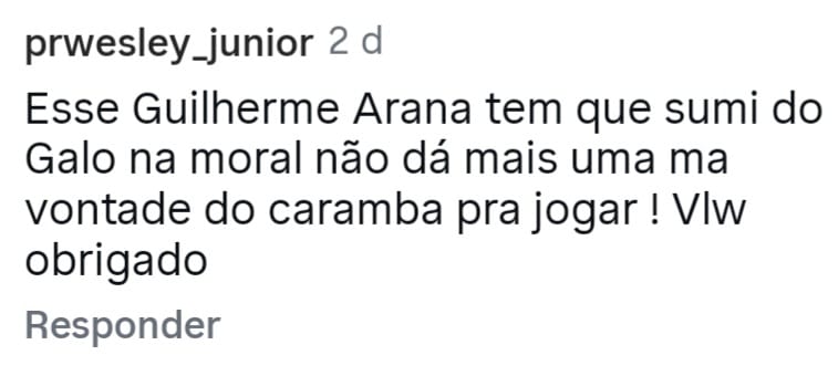 Esses comentários foram tirados do perfil Central do Galo no Instagram, muita gente p…. da vida com o time e pedindo a saída de jogadores, Guilherme Arana aparecendo em evidência no centro da ira do torcedor Alvinegro.