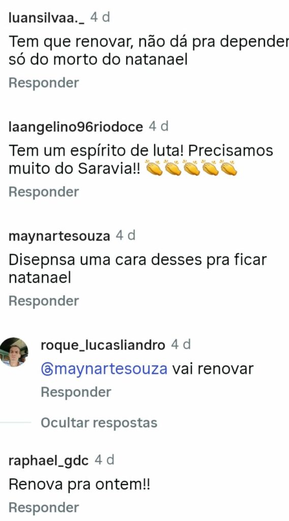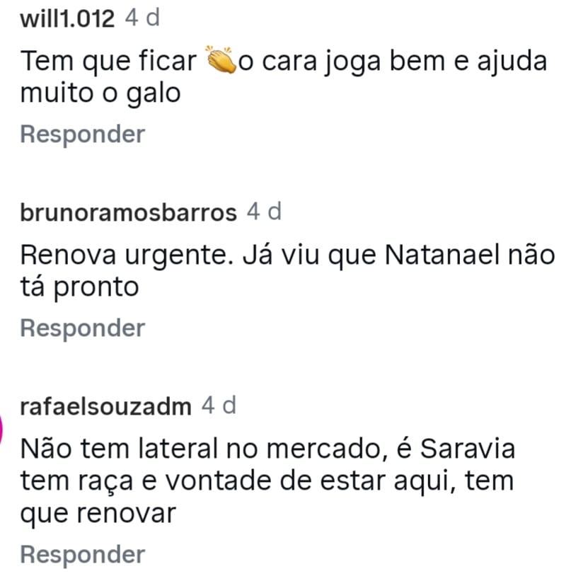 Torcedores no perfil do Instagram Central do Galo, fizeram um pedido ao departamento de futebol liderado por Paulo Bracks. Acerta logo o novo contrato com Saravia para 2026, assina logo: